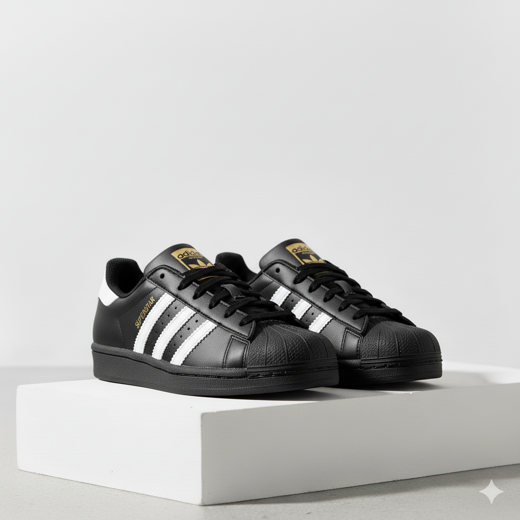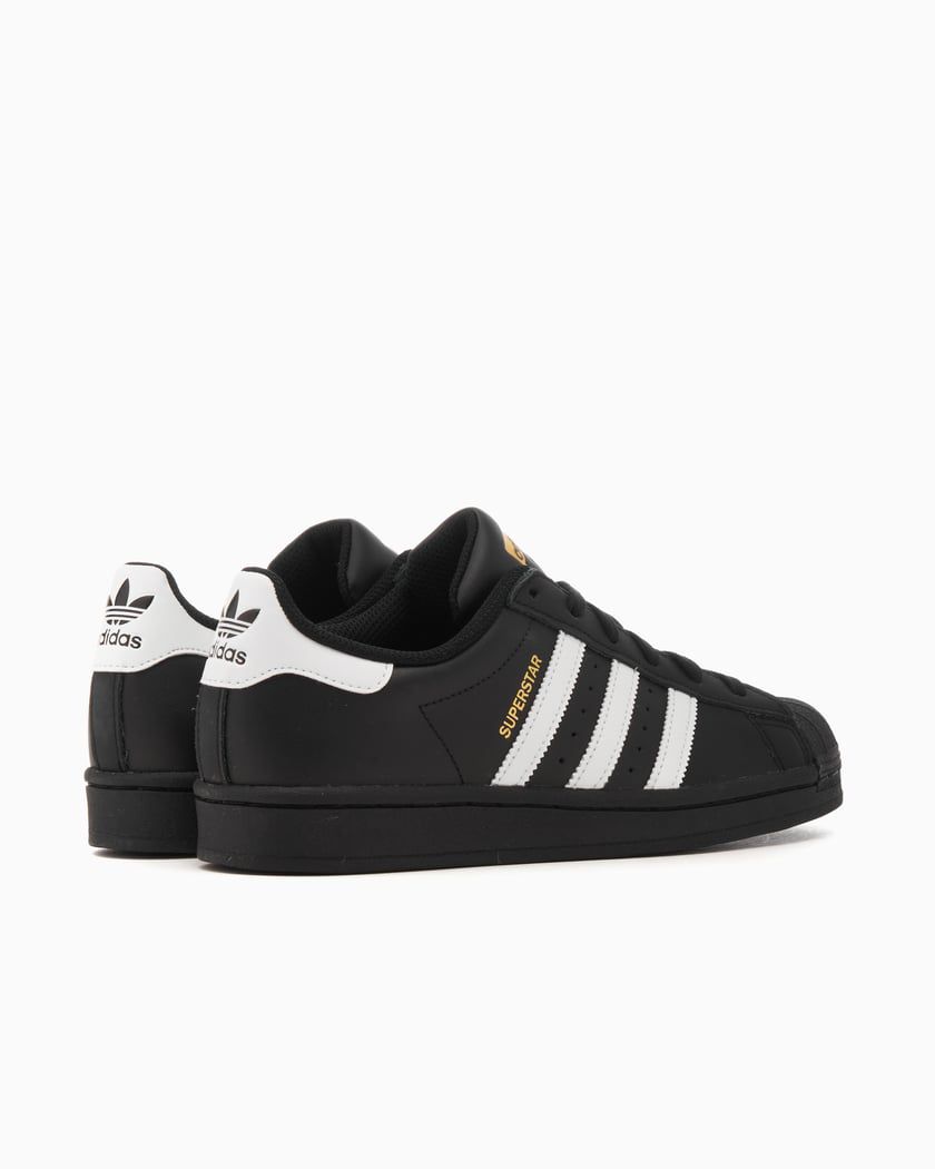 L'empeigne en cuir lisse noir de qualité supérieure garantit durabilité et un confort impeccable dès le premier enfilage. Fidèles à leur héritage, les célèbres trois bandes Adidas en cuir blanc pur contrastent superbement sur le flanc, tandis que le logo "Superstar" en lettres dorées apporte une touche de raffinement subtil. Le renfort de talon blanc immaculé vient parfaire l'équilibre des couleurs.