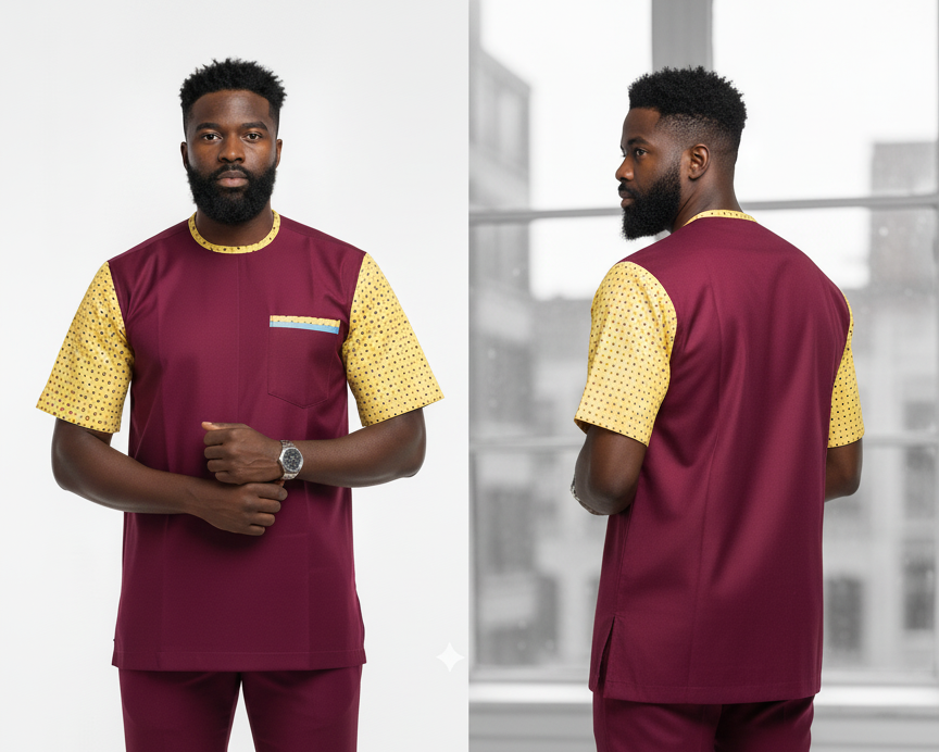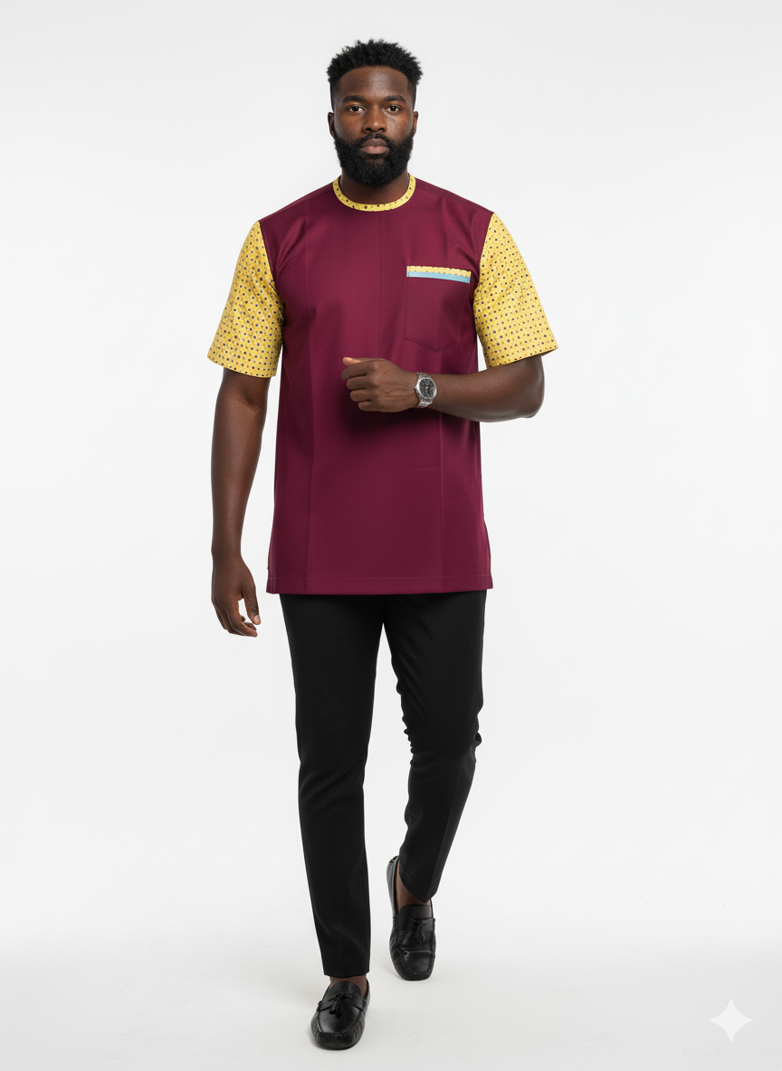 Description : Incarne l'alliance parfaite entre tradition et modernité avec cette tunique pour homme. Son tissu bordeaux de haute qualité est sublimé par des manches courtes ornées de motifs géométriques dorés discrets, apportant une touche d'originalité. Le col rond et la poche poitrine sont rehaussés d'un liseré jaune vibrant, soulignant l'attention portée aux détails. Idéale pour les événements formels ou pour rehausser votre quotidien.