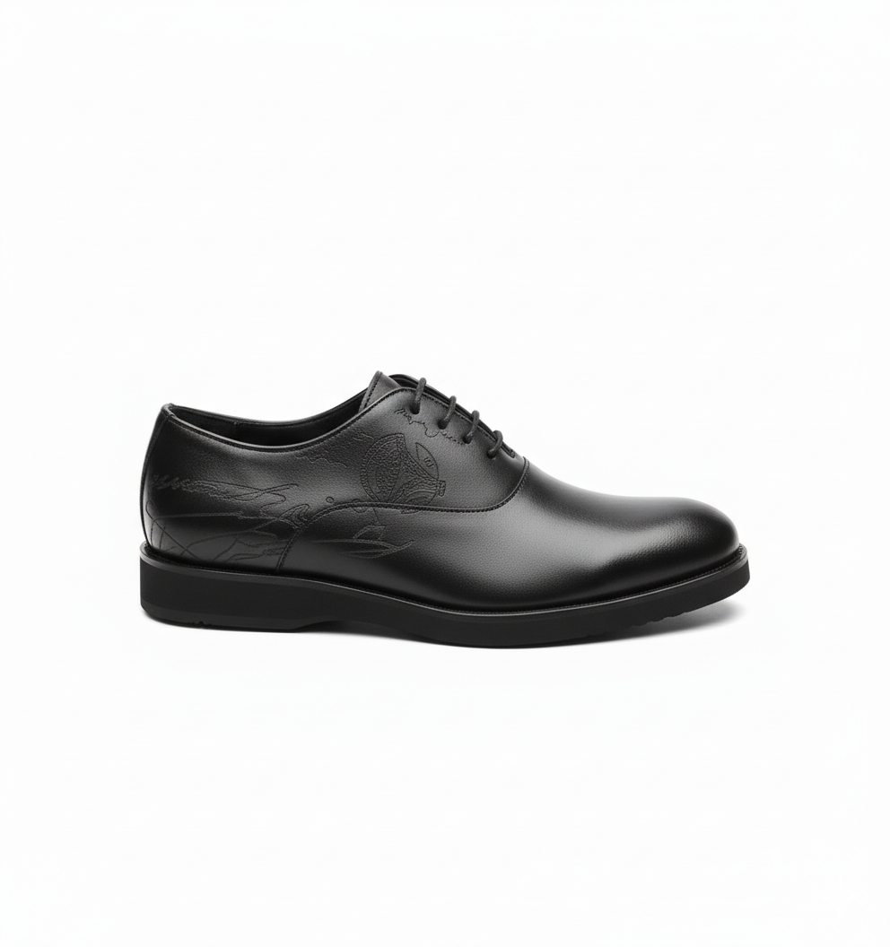 Introduisez une dimension d'art et de sophistication à votre garde-robe avec nos Richelieus en cuir noir, sublimées par des motifs discrets mais percutants. Confectionnées dans un cuir noir profond, ces chaussures classiques se distinguent par des gravures ton sur ton sur le côté et l'empeigne, offrant une texture et un relief uniques qui captent la lumière. Loin des conventions, ces Richelieus sont le choix idéal pour l'homme qui apprécie les détails subtils et la qualité artisanale. Elles apportent une touche de caractère distinctif à vos tenues formelles ou à vos ensembles élégants, garantissant une présence remarquée et raffinée.